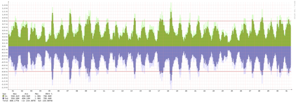 Trafiktoppen var som högst 886,2 Mbit/s, vilket är 29,5% av maxkapaciteten. 95:e percentilen låg på 462,0 Mbit/s, vilket betyder att 95 procent av tiden hade Amsterdam en förbrukning på under 15,4% av maxkapacitet.