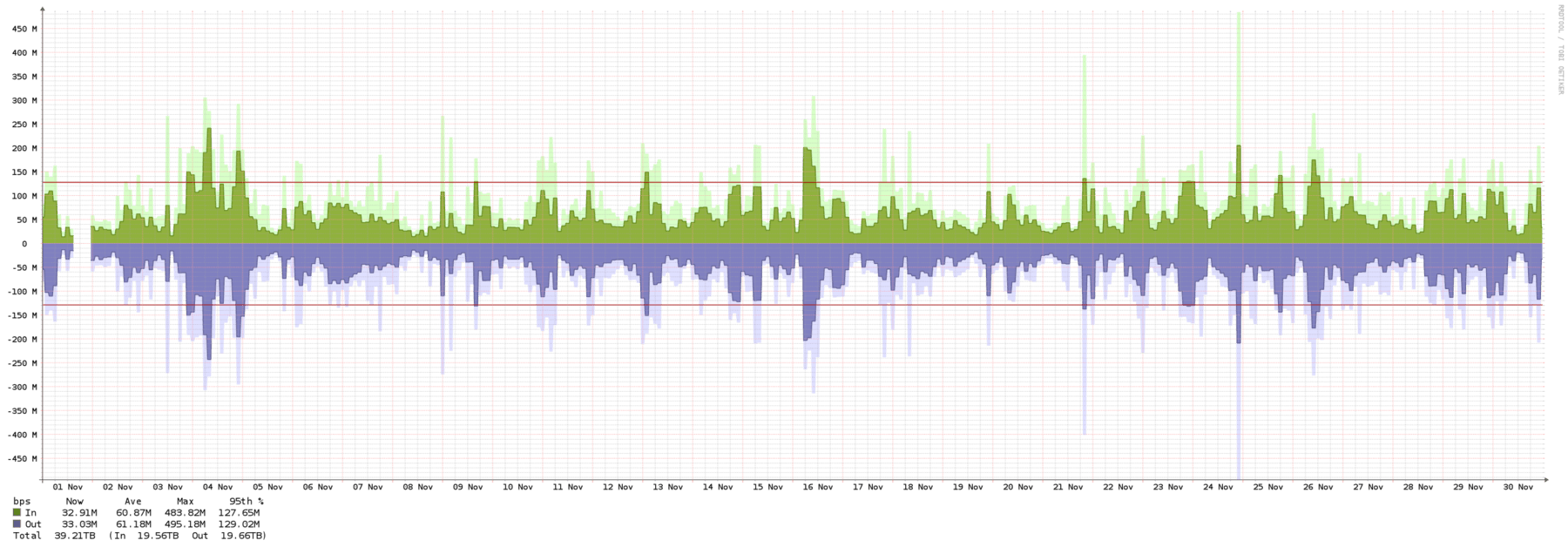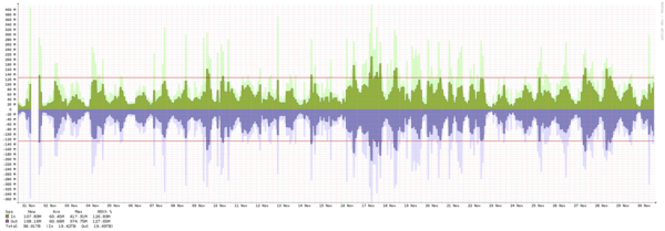 OVPN har kapacitet att leverera 3 Gbit/s i Amsterdam, men under november så låg förbrukningen i snitt på 258,6 Mbit/s.